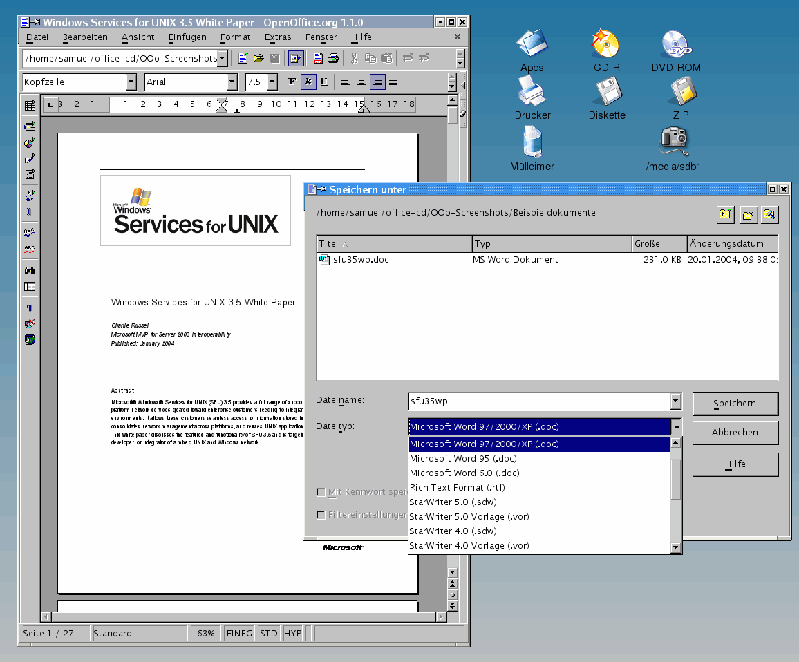 Grafik17 OpenOffice.org erlaubt es Anwendern, OpenOffice.org-Dokumente in so beliebte Formate wie DocBook sowie verschiedene Formate kleinerer PDAs wie etwa AportisDoc zu exportieren. Dies ermöglicht den Transport der Dokumente auf den kleinen Palm Pilots bzw. Pocket PC PDAs.